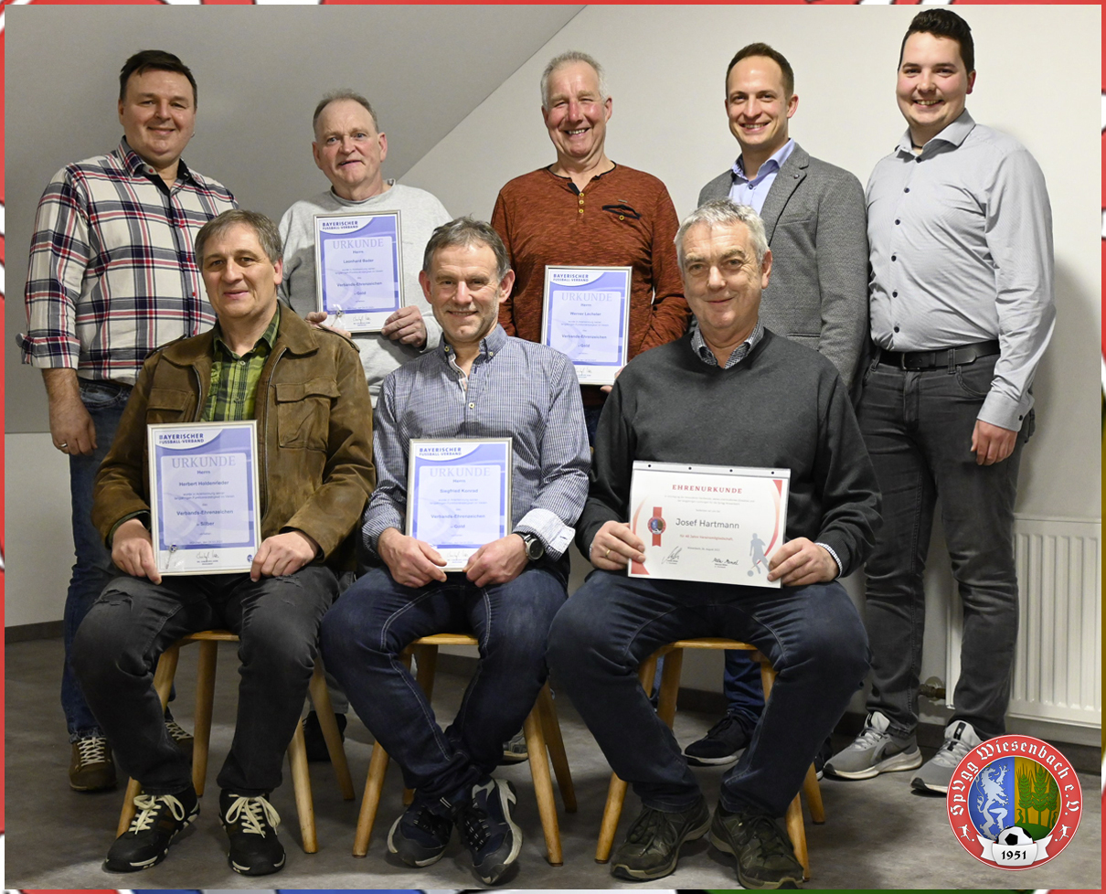 Ohne unsere Mitglieder und deren Engagement und Treue würde es die SpVgg Wiesenbach in dieser Form nicht geben, in diesem Bewusstsein durfte Vereinsehrenamtsbeauftragter Max Thurn Auszeichnungen von Verein und BFV überreichen. Josef Hartmann und Anton Fischer erhielten für ihre 48- bwz. 68-jährige Treue zur SpVgg Wiesenbach die Ehrenurkunde des Vereins. Annemarie Geißler, Herbert Holdenrieder und Gerhard Jonscher wurden mit dem Verbandsehrenzeichen in Silber ausgezeichnet, Gold ging an Leonhard Bader, Siegfried Konrad und Werner Lecheler.