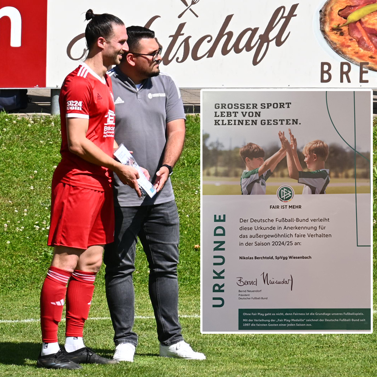 FAIR IST MEHR Ehrung für Nikolas Berchtold Im Vorfeld unserer Kreisliga-Partie gegen die TSG Thannhausen wurde unser Spielertrainer Nikolas Berchtold von Fatih Kayan, Spielleiter des Kreises Donau, für sein faires Verhalten ausgezeichnet. Beim Vorbereitungsspiel gegen den SV Waldstetten hatte Niko dem Schiedsrichter bestätigt, dass der Ball beim 2:2-Ausgleich klar hinter der Linie war – ein Eingeständnis, ohne das der Treffer nicht gezählt hätte. Als Dank für dieses vorbildliche Verhalten erhielt er vom Verband eine Urkunde und ein Handtuch als kleines Präsent. |