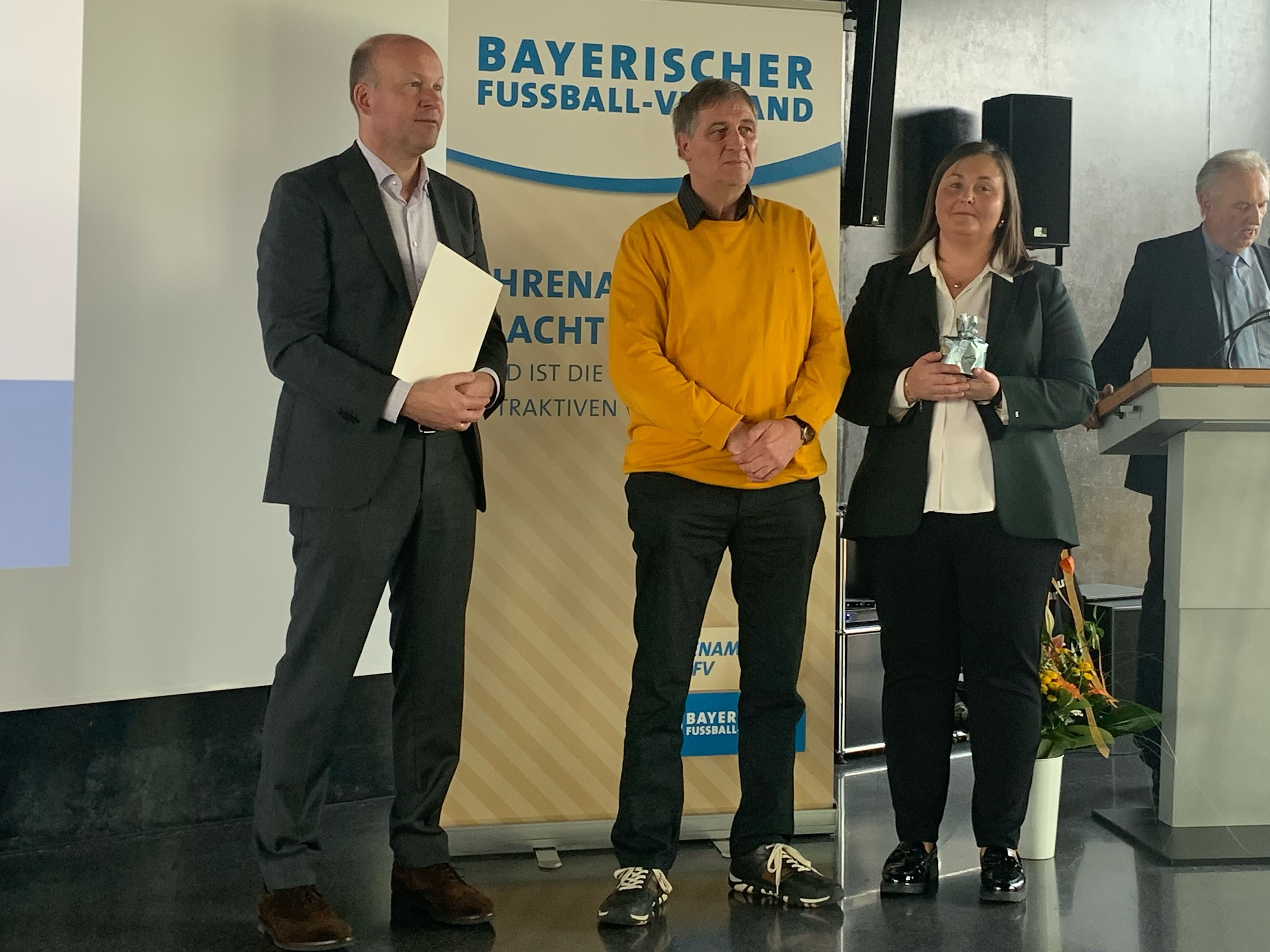 Die Auszeichnung und Übergabe der Urkunde an Herbert (Mitte) durch Bezirkstagspräsidenten Martin Sailer (links) und Sabrina Hüttmann, Bezirks-Vorsitzende Schwaben (rechts), fand im Roma-Forum in Burgau statt.
