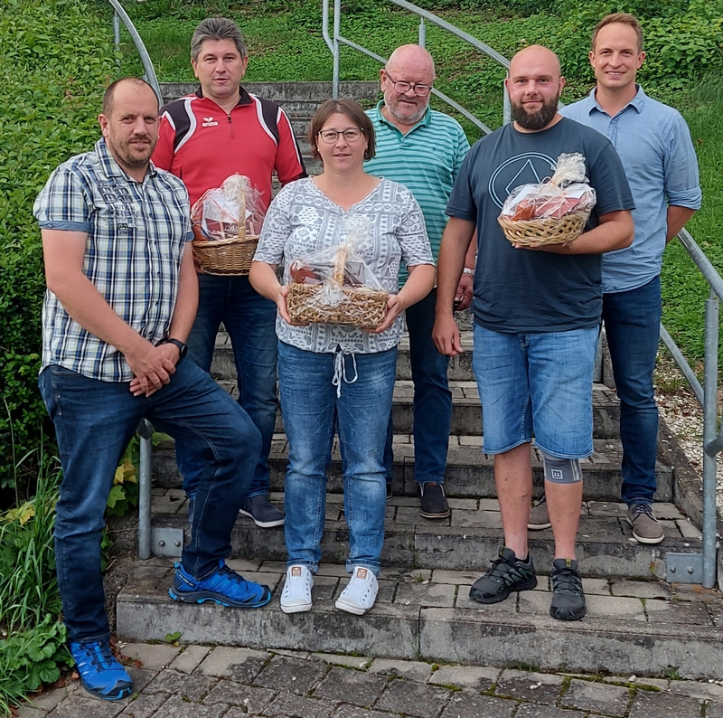 In seiner Laudatio im Rahmen eines kleinen Helferfestes bedankte sich 2. Vorstand Tobias Miller bei allen freiwilligen Helfern für ihr uneigennütziges Engagement für ihre SpVgg Wiesenbach, übergab kleine Präsente an das Team der Projektleitung und ließ durchblicken dass die Projektwarteschlange noch nicht ganz leer sei. Unser Bild zeigt Jürgen Olzmann, Robert Fäustle, Heidi Olzmann, 1. Vorstand Leopold Müller, Philipp Kuen und 2. Vorstand Tobias Miller stellvertretend für alle Helfer.