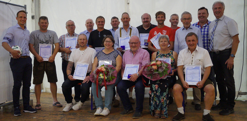 Der Samstag startete mit dem A-Junioren Derby zwischen der JFG Günztaler Kickers und dem TSV Krumbach, danach zeigten die „Old Men Wiesenbach“ ihr Können gegen eine gemischte Truppe aus Babenhausen und dem Ries. Mit einer kurzen und knackigen Begrüßung läutete 1. Vorstand Tobias Miller den Festabend im gut gefüllten Festzelt ein und gab einen kurzen Überblick über die 70-jährige Vereinsgeschichte der SpVgg Wiesenbach mit vielen Höhen und auch kleineren Tiefen, verwies auf die sehr gute Arbeit seiner Vorgänger im Amt Leopold Müller und Horst Schebesta und die großen Fußstapfen in die es nun für ihn und seine Vorstandschaft zu treten gelte. Stellvertretende Landrätin Ruth Abmayr überbrachte Verein und Gästen die Grußworte des Landkreises Günzburg, für die Gemeinde Wiesenbach sprach der erste Bürgermeister Gilbert Edelmann, ließ die ein oder andere Anekdote aus seiner "SpVgg-Historie" einfließen und stimmte zum Abschluss "Gute Freunde" an. "Gute Freunde", sprich ehrenamtliche Helfer, sind das Herzblut der SpVgg Wiesenbach und dafür standen sie am Festabend im Rampenlicht. Nach den Grußworten von Fritz Birkner, BLSV Chef im Kreis Günzburg, und Kreisehrenamtsbeauftragtem John Wiedemann wurde zunächst - für ihn selber überraschend - Vereinsehrenamtsbeauftragter Max Thurn für sein langjähriges Engagement ausgezeichnet. Danach war er selbst wieder Herr seines Ressorts und durfte mit John Wiedenmann, Tobias Miller und Gilbert Edelmann Urkunden und Medaillen des BFV an treue Vereinsmitglieder überreichen. Im Anschluß würdigte er im Namen der SpVgg Wiesenbach verdiente Mitglieder für ihre Treue zum und ihr Engagement für "ihren" Verein - und verwies in Anbetracht der Namen auf seiner Liste dass die SpVgg für viele Familiensache, ja sogar Herzensangelegenheit ist und dafür auch der Festabend im Zelt der eigenen Geburtstagsfeier im trauten Heim vorgezogen würde. Wortgewandt beschloss Vorstand Tobias Miller den offiziellen Teil des Festabends und übergab die weitere Leitung an den stimmungsvollen Musikverein Ellzee-Ichenhausen.
